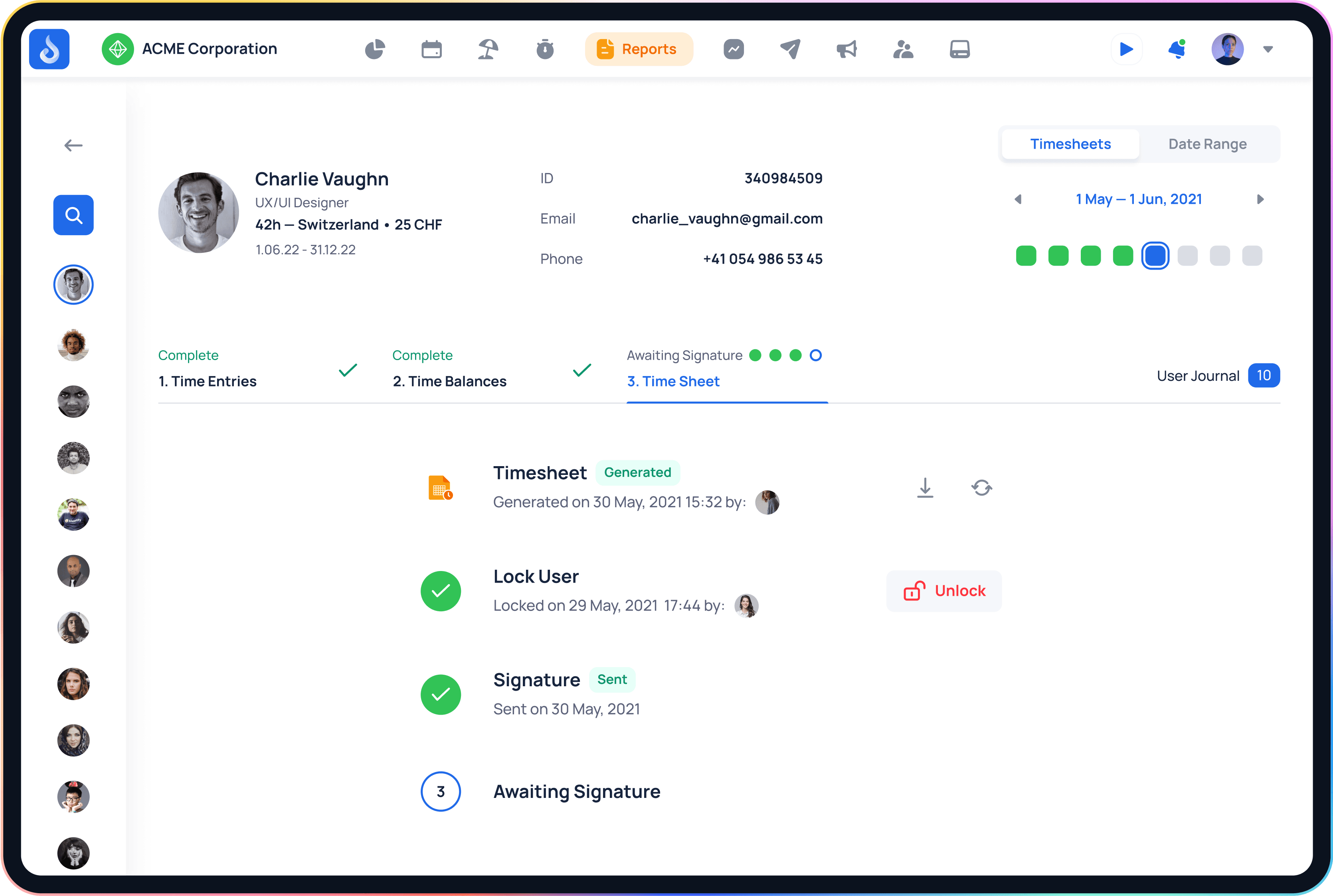 Überprüfen und genehmigen Sie Arbeitszeiten, unterzeichnen Sie Zeiterfassungsblätter digital und exportieren Sie alle Daten nahtlos direkt in Ihre Lohnabrechnung.